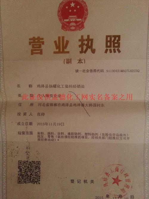 鸡泽县扬耀化工染料经销处 >> 资质证书